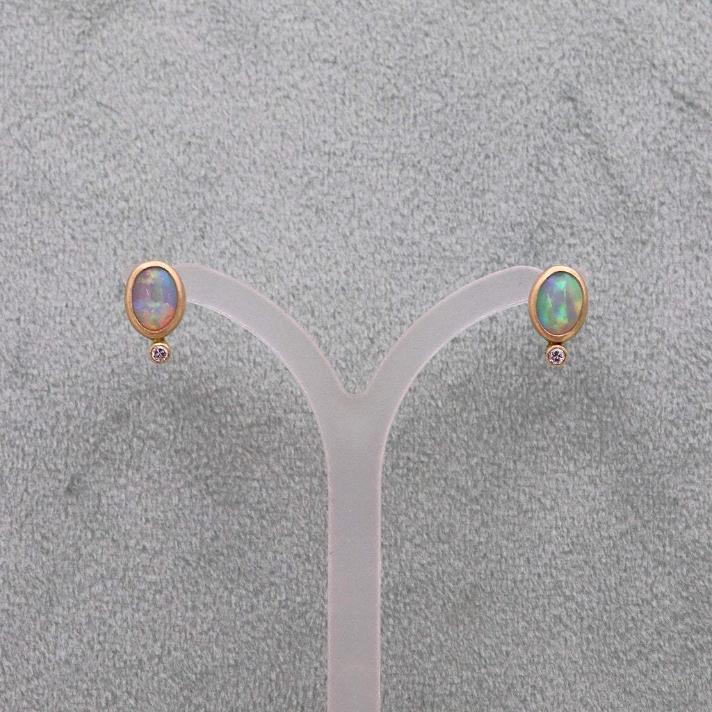 Shimmering miniature Australian opals are each paired with a sparkling white diamond. The earrings are made from solid and recycled 18ct yellow gold, with a sterling silver back and ear post, all alloyed in Rachel's central London studio. The gold has a matte finish to really show the buttery yellow tone of the metal. Each opal has been sourced from miners in Australia and hand cut by Ancients17 in the USA.