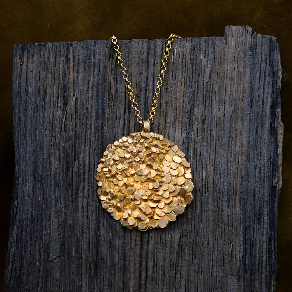 A deliciously bold and scintillating amulet inspired by the texture of caddis cases and their protective properties. This statement pendant is made from solid bronze on a 14ct gold fill chain measuring 18 inches and fastening with a bolt ring clasp/mechanism. The pendant measures 4cm wide and is flat with an organic molten and smooth texture on the reverse.