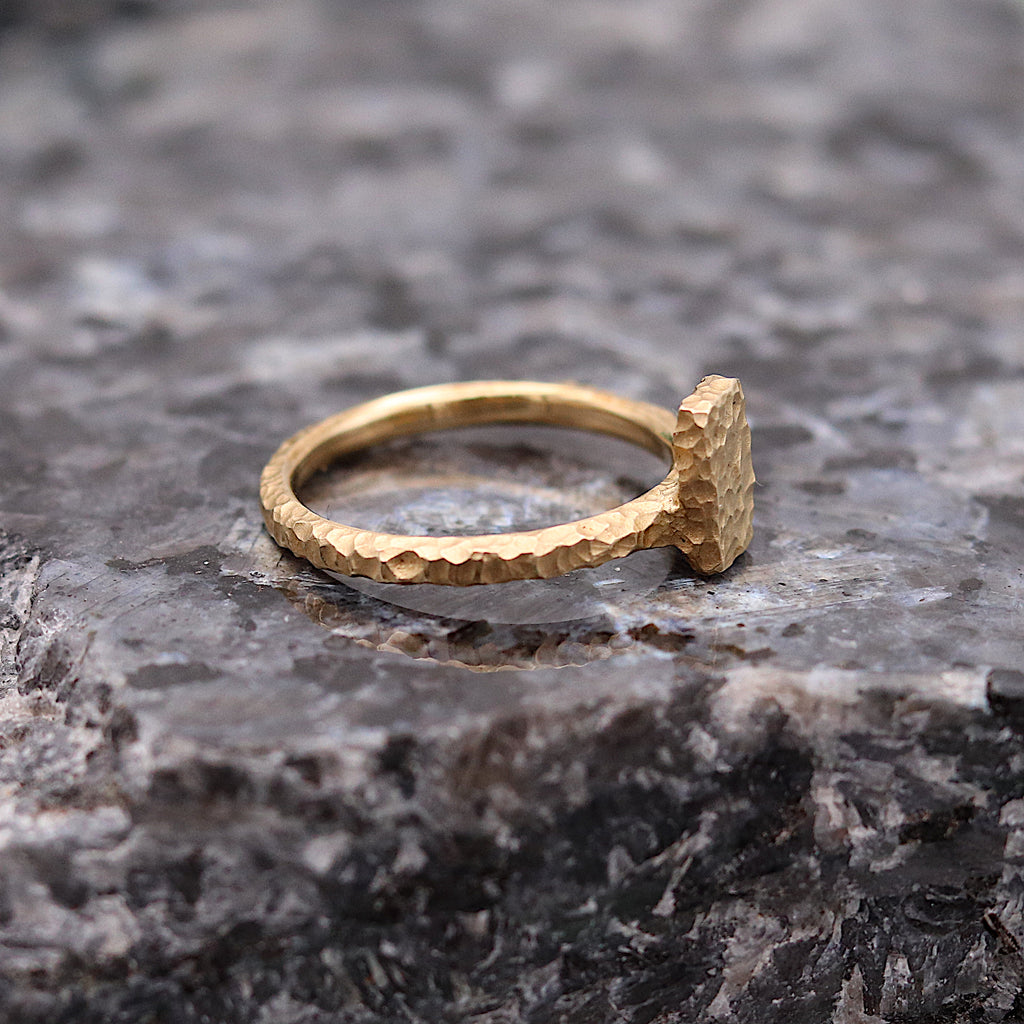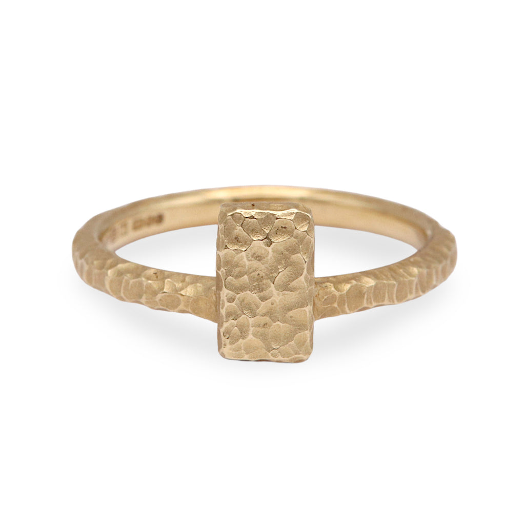 A simple golden rectangle ring with a heavy texture inspired by the coastal textures and organic juxtapositions of the Cornish coast, with a high polished finish on the inside for comfort. The shape sits on top of the ring, making it ideal for stacking with other bands to build your own unique style.