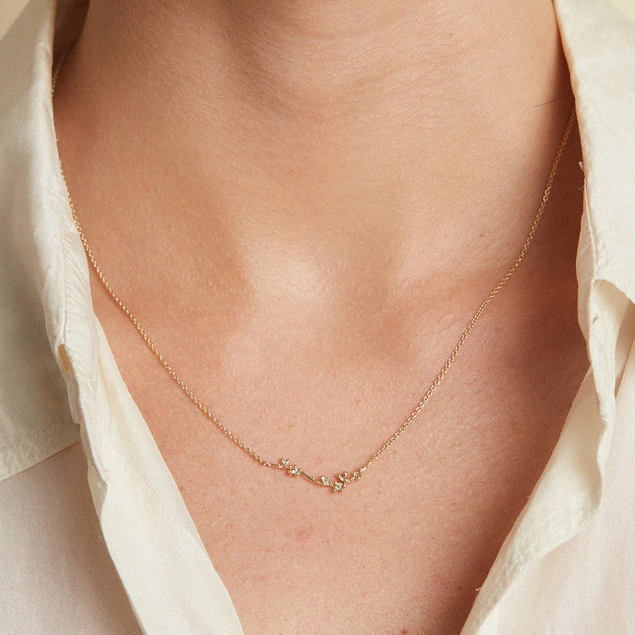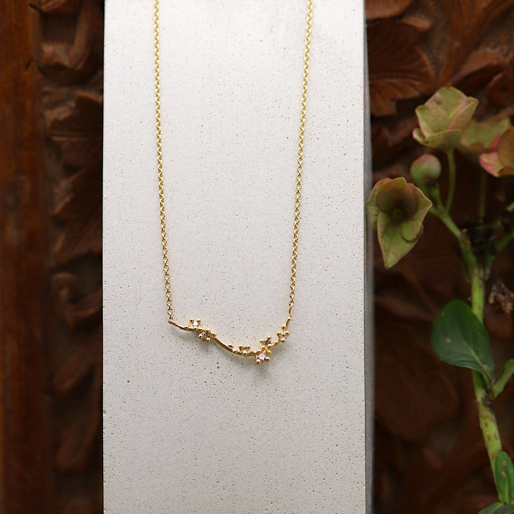 A necklace perfect for everyday wear with just a touch of sparkle from the tumbling cluster of twinkling diamonds and recycled 14ct golden granules, on a fine 14ct gold chain with a trigger clasp. Pendant size: 23.8mm x 8.7mm, chain length 16 and 18 inches.