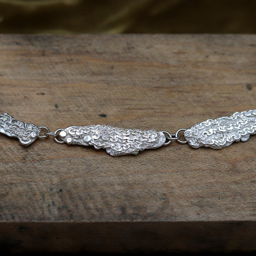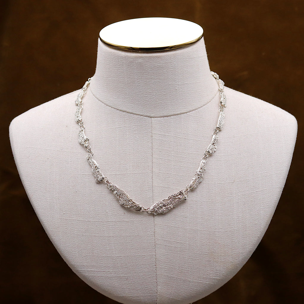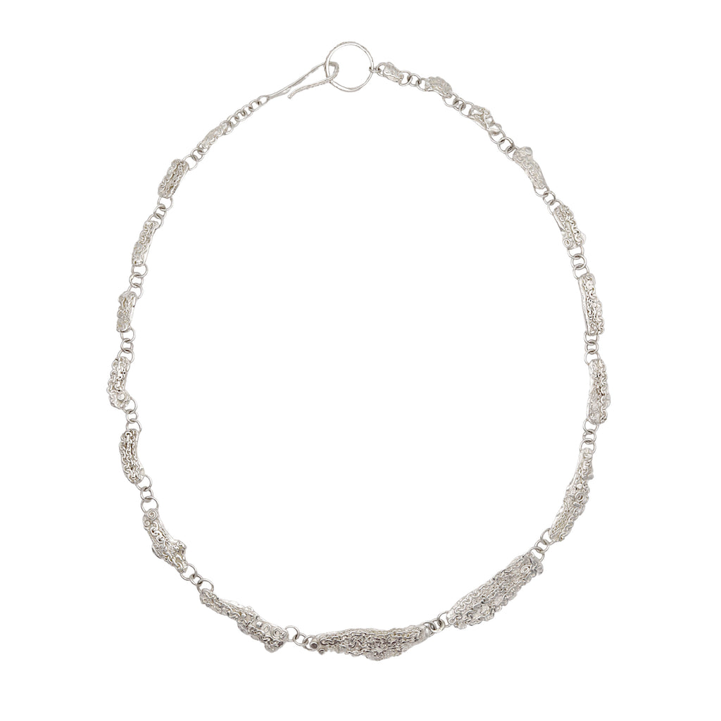 Molten sterling silver links with lace-like textures made from dainty hammered chain and tiny silver swirls and granules, fitted with a handmade hook clasp. This oceanic necklace has exquisite details, inviting you to look closer.
