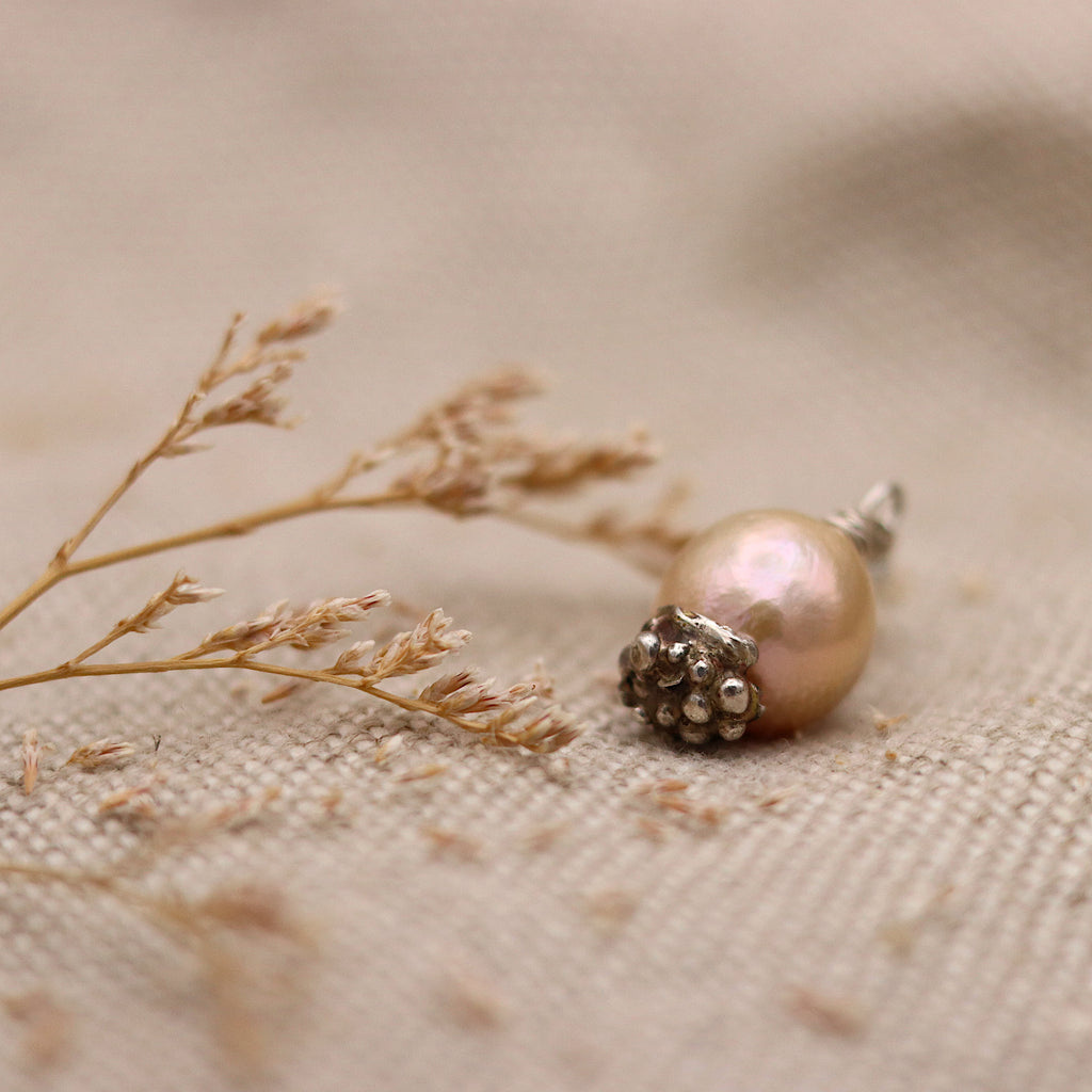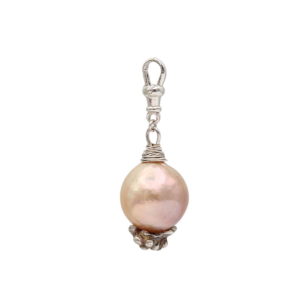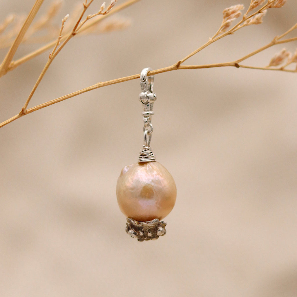 A beautiful large golden peach coloured South Sea pearl charm with a sterling silver base inspired by natural textures, and fitted with an Albert swivel clasp to attach onto your necklace. South Sea pearls are prized for their large size and thick nacre layer which makes them super lustrous, and can take from three to five years to cultivate.