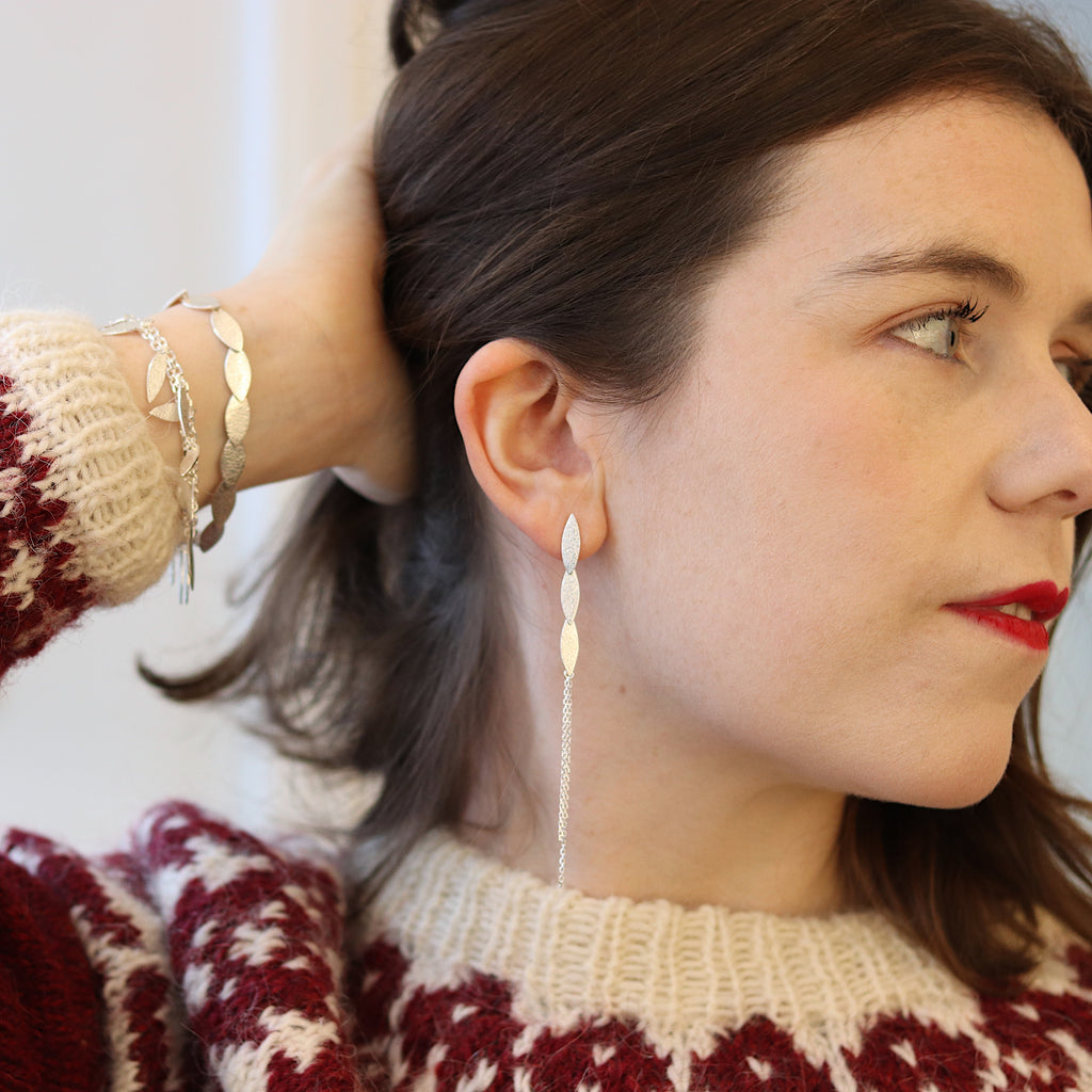 The Icarus tassel earrings are a dainty drop earring with beautiful fine chain tassels. They are made from sterling silver and measure 4mm x 9cm.