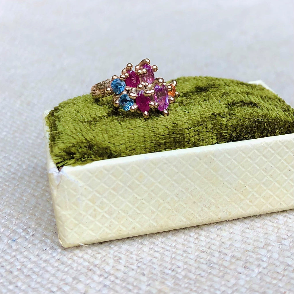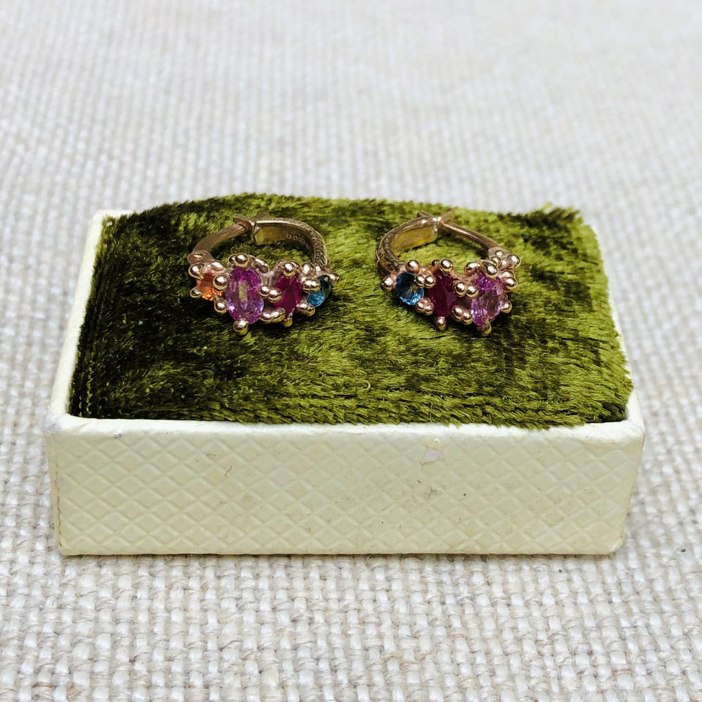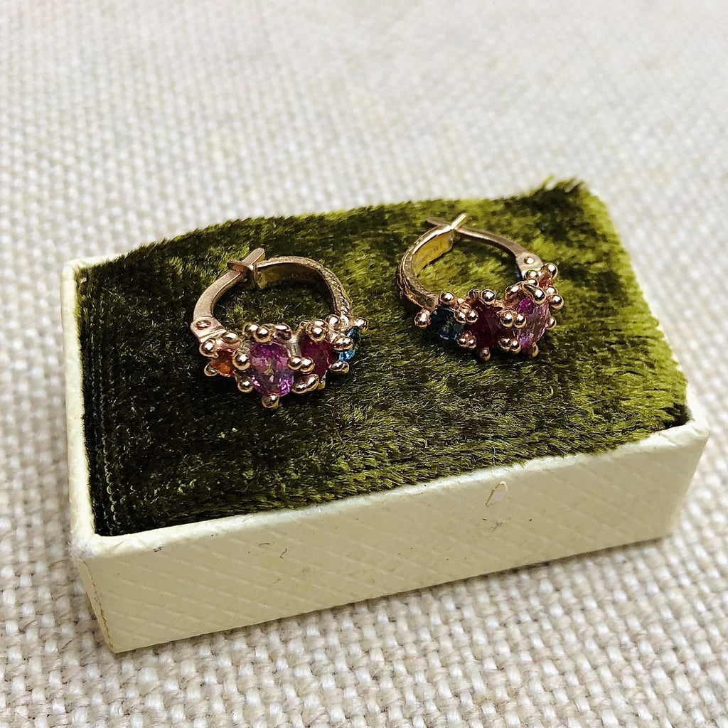Playing on the themes of a traditional Harlequin pattern, these sweet little huggie hoops combine different cuts of gemstones in a beguiling way. Designed to perfectly fit your earlobes! These 9ct gold hinged earrings feature orange, pink and blue sapphires, and a red ruby, and measure 1cm diameter.
