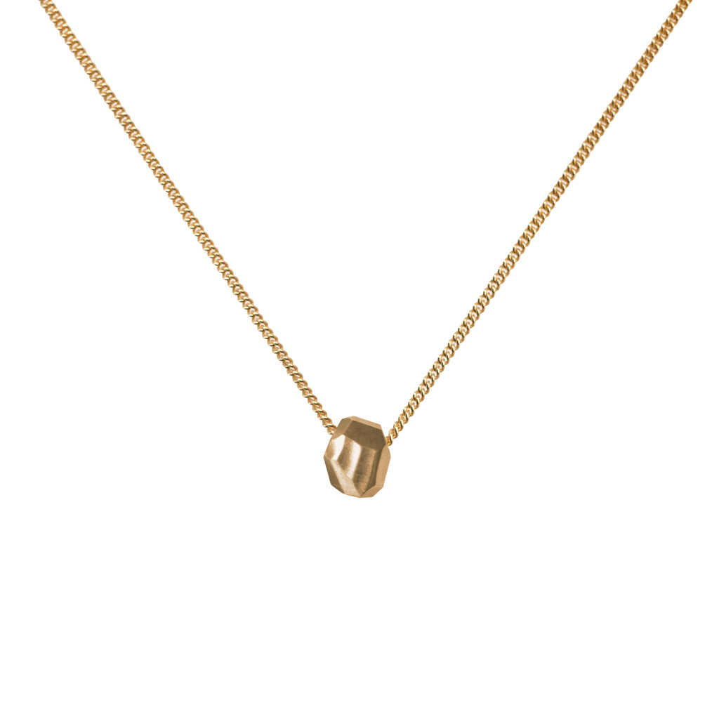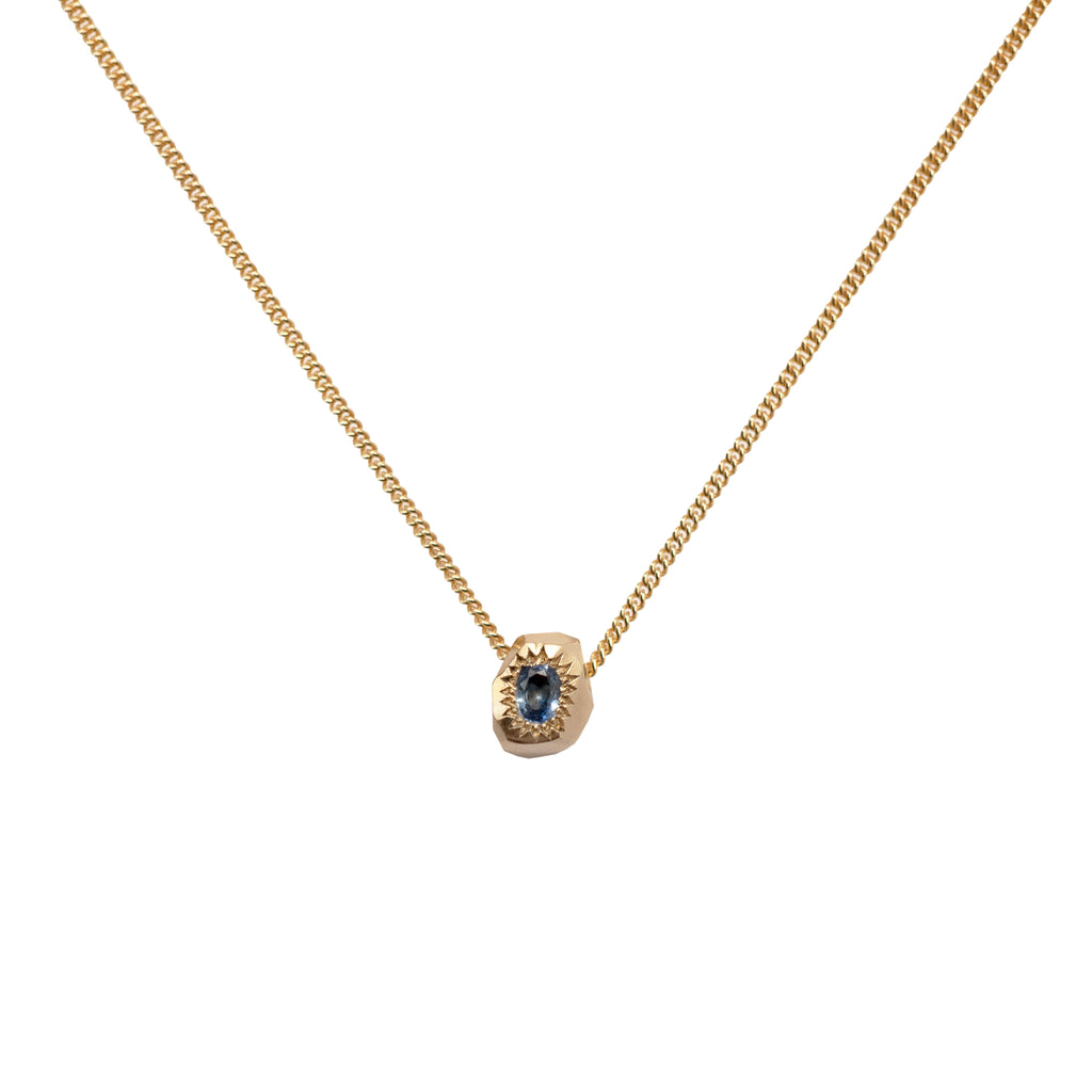Handcrafted in 9ct yellow gold, the Gea necklace features an oval blue sapphire set within a sculptural, faceted pendant. Inspired by geological formations, the textured surface plays with light, while the deep blue of the sapphire adds a touch of quiet elegance. The design is reversible, offering two distinct looks in one — one side showcasing the gemstone, the other highlighting the raw beauty of plain gold. Suspended on a curb chain, this understated piece is perfect for everyday wear or layering with your favourite necklaces.