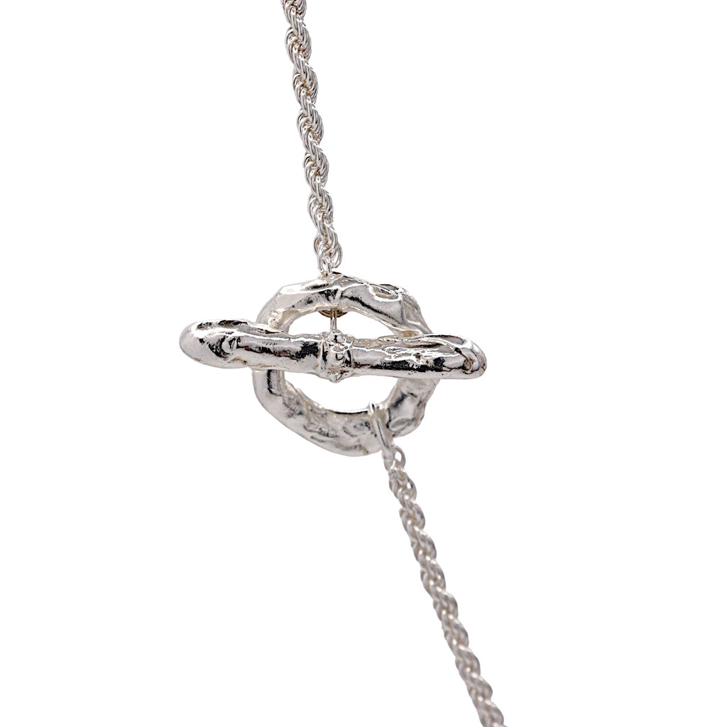 A simple rope chain is always a staple piece for your wardrobe. The sterling silver necklace has a decorative molten T Bar clasp as the main feature, intended to be worn at the front as extra adornment. At 16 inches long, this chain is worn close to the neck and is ideal for layering with other longer necklaces.