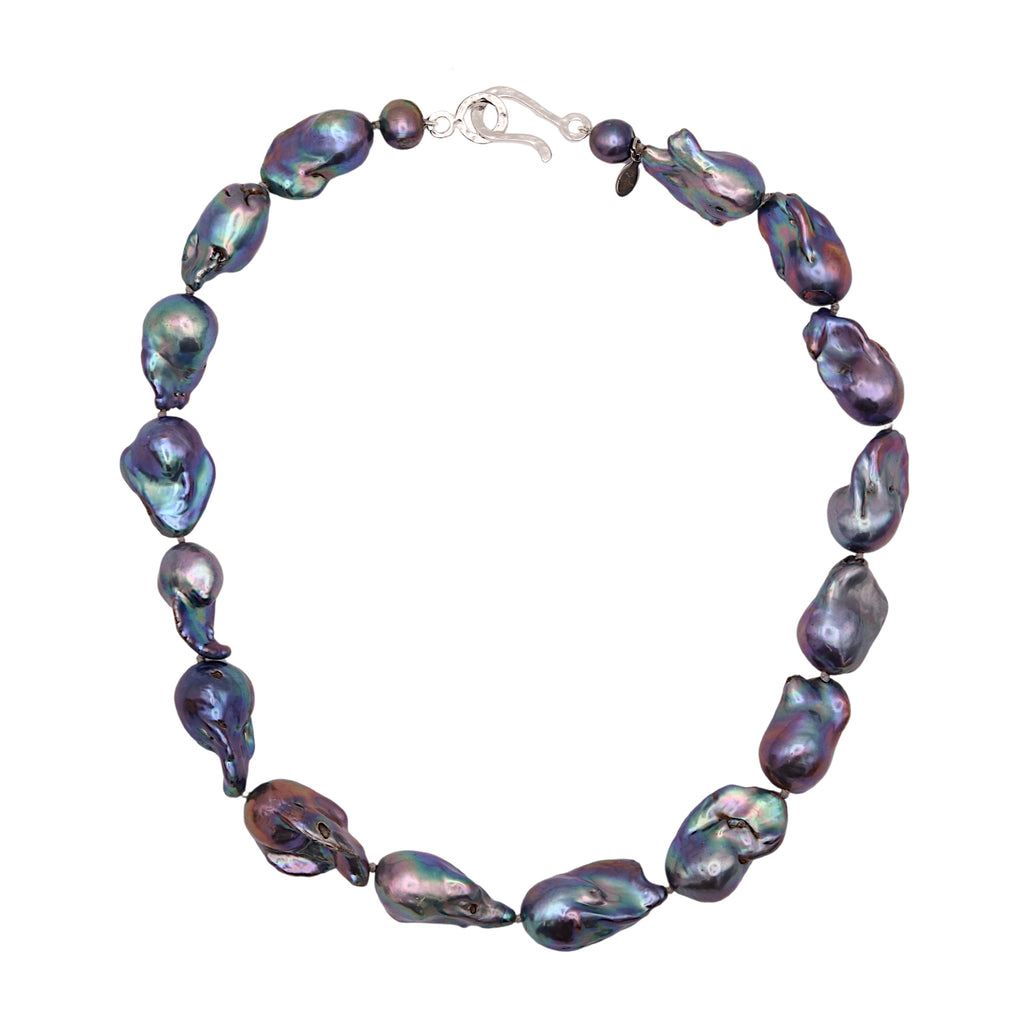 A long knotted strand of vibrant baroque pearls in hues of blue with shimmers of green and purple. Each uniquely shaped pearl measures approx 2.5cm x 1.5cm and is fitted with a hammered sterling silver hook clasp. Wear this mystical, statement pearl necklace to elevate your daily outfit.
