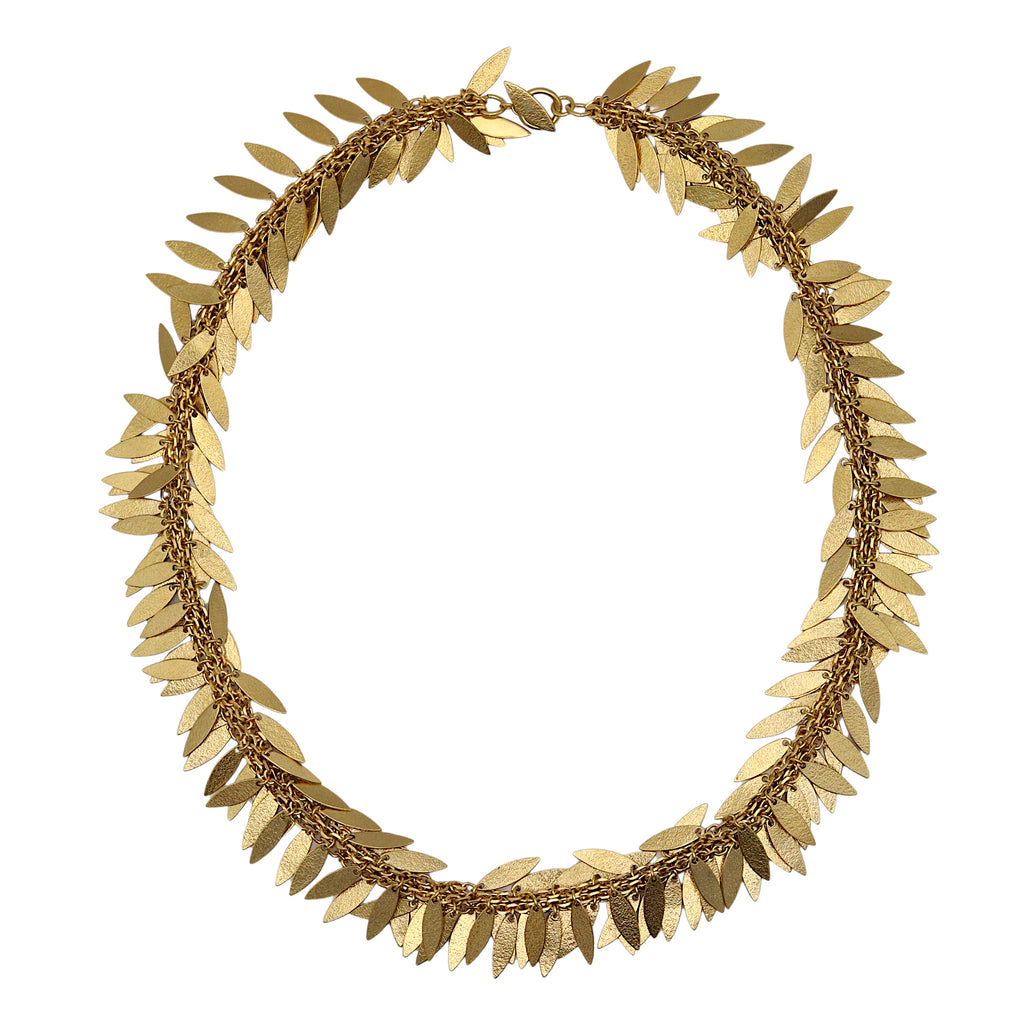 A statement layered necklace with cascading feather shapes made sterling silver with 18ct gold vermeil to dance and shimmer. Fastened with a subtle feather shaped T Bar clasp hidden hook clasp, and 19 inches in length.