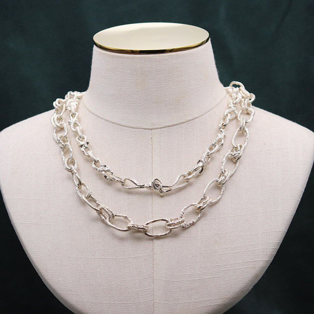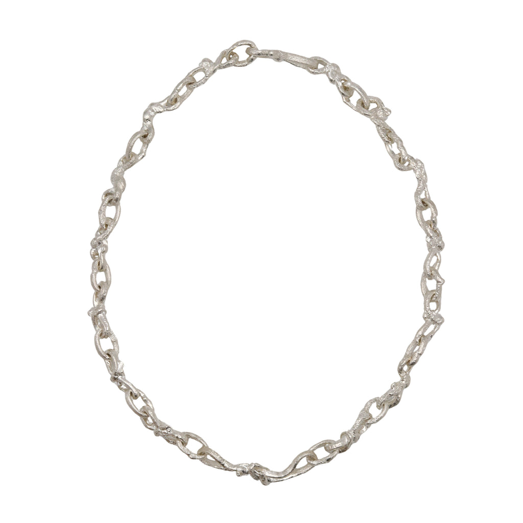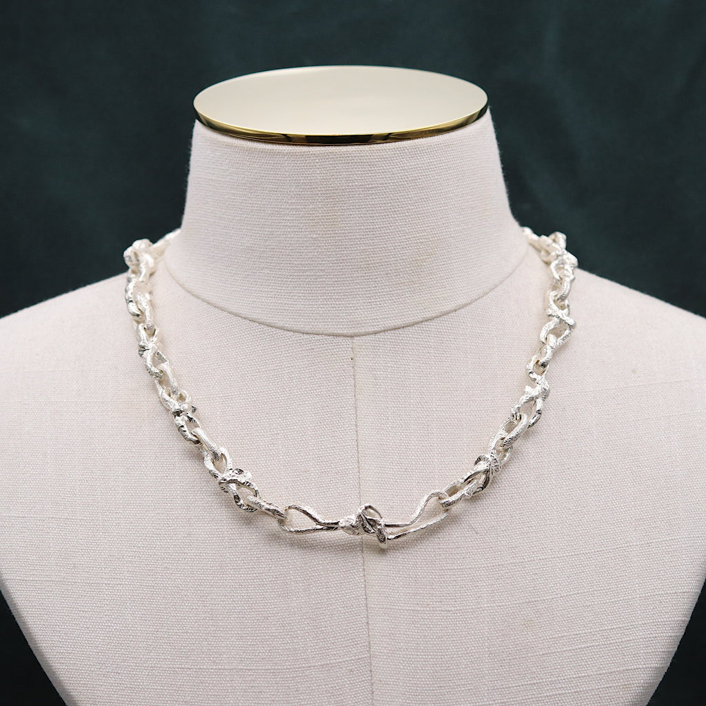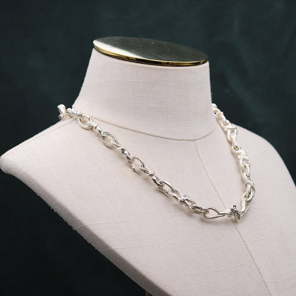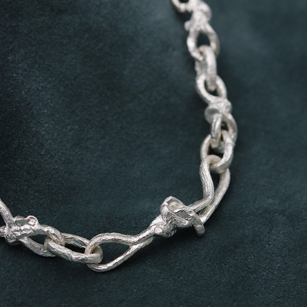 An 18 inch chunky chain of irregular, molten knotted links of sterling silver, with a hook clasp. This textured chain has such a unique shape and a lovely weight to it, wear layered up with other chains or on its own for a statement look.