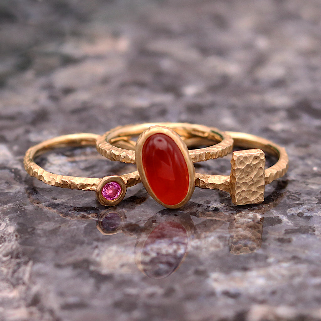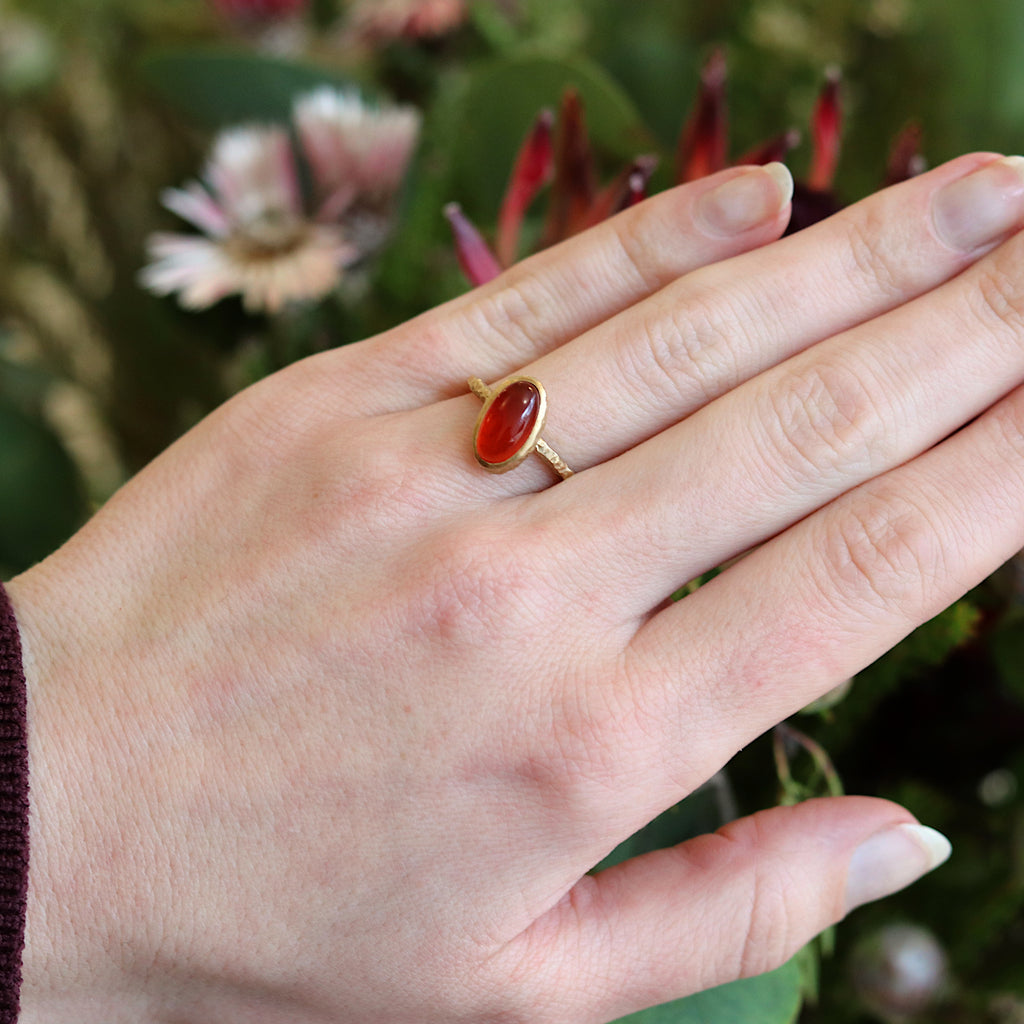 A juicy vibrant red cabochon oval garnet sits diagonally on a heavily textured matte 9ct gold ring, with a rub-over bezel setting. The texture is inspired by the coastal textures and organic juxtapositions of the Cornish coast, and is highly polished on the inside for comfort. The stone sits on top of the ring, making it ideal for stacking with other bands to build your own unique style.