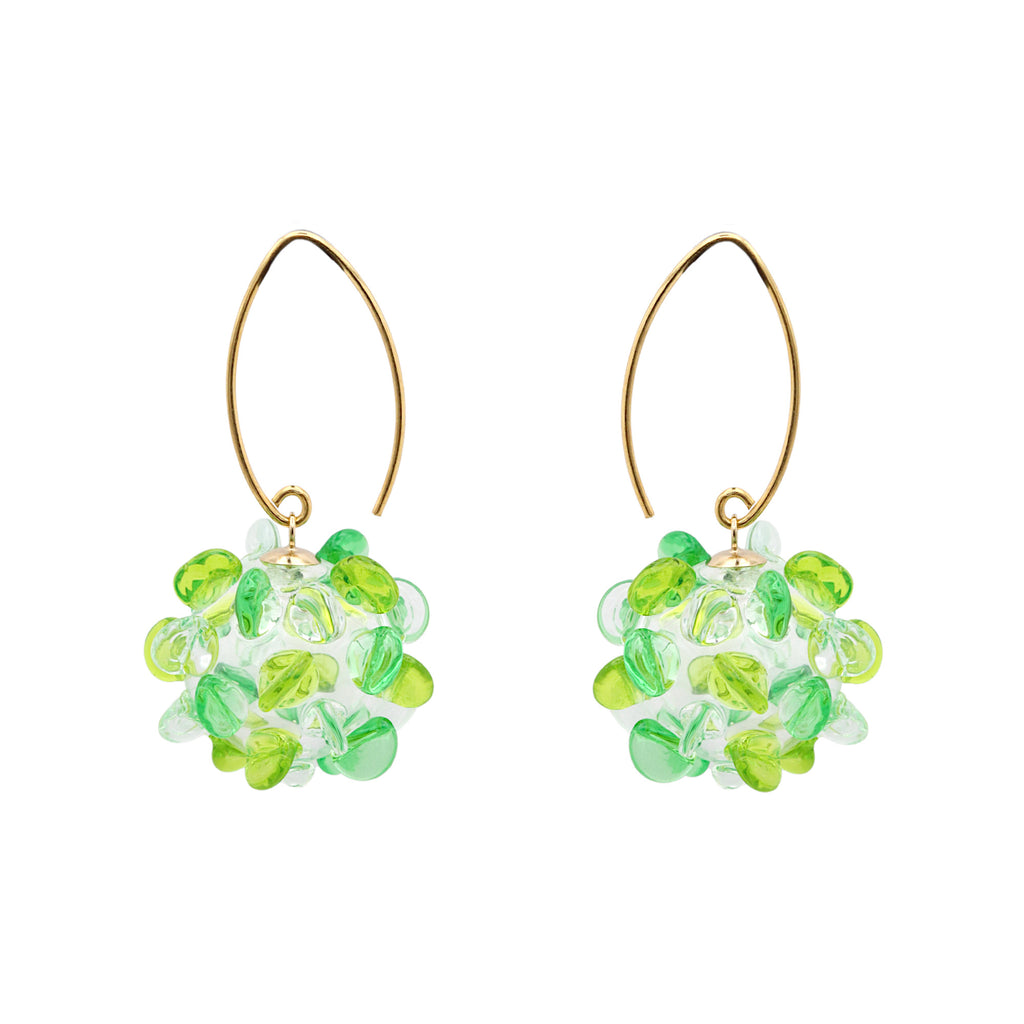Hollow glass ball beads with little petals of green and lime green glass, each individually handmade by Olga Alianova using lampworking and glassblowing technique, with gold fill ear hooks. Gold fill is when gold is mechanically bonded onto a base metal. Earring length 4cm.
