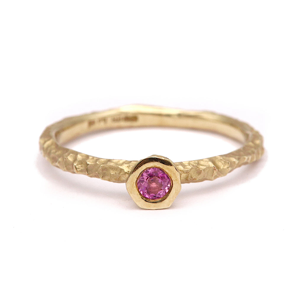 A vibrant round pink sapphire sits embedded in a polished gold setting on top of a textured matte 9ct gold ring. The texture is inspired by the coastal textures and organic juxtapositions of the Cornish coast, and is highly polished on the inside for comfort. The stone sits on top of the ring, making it ideal for stacking with other bands to build your own unique style.