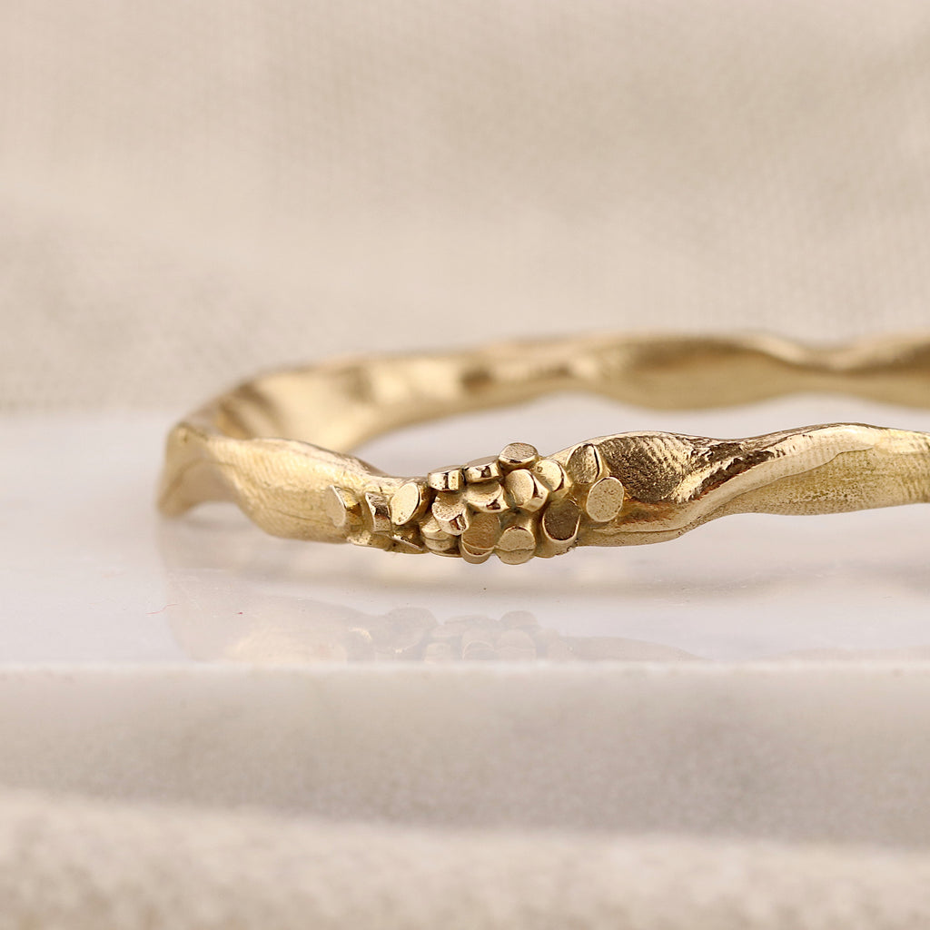 The Caddis collection is intended to bring you feelings of protection and comfort found in a cosy home. Inspired by the caddisfly larvae, a clever creature which builds its own protective dwelling to house itself whilst in its most vulnerable state. They can be found living in the bottom of our ponds and streams where they gather their favoured materials from their natural environment and build a distinctive structure. Carefully sorted stones, twigs, or shells are all bound by their waterproof silk to be velvety smooth inside for their delicate bodies. This jewellery collection replicates these organic outer textures in rings that appear as mini sculptures which are carefully hand finished to be comfortable to wear.